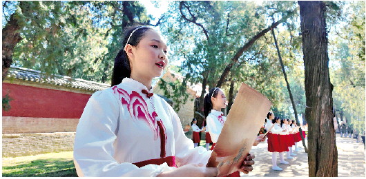 4月4日上午,悠扬古雅的乐声在尼山山间缓缓回荡。伴着《尼山敬师歌》的诵读之声,丙午年春季尼山孔庙祭孔大典非遗展演正式开始。琴箫相和、钟磬齐鸣,古韵流转;《诗画尼山》《关雎》等诗歌名篇依次吟诵,为生机盎然的尼山铺展开一场文脉传承的儒家文化盛宴。图为学生们在诵读《尼山敬师歌》。 记者 易雪 通讯员 苏颖 摄影报道