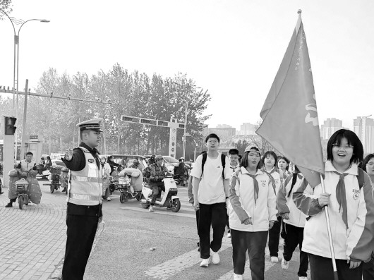 当日清晨5点半,执勤民辅警提前到岗到位,在途经路口、重点路段、陵园周边定点值守,规范指挥疏导车流,引导社会车辆减速避让、有序通行,全程护送学生队伍安全通过斑马线与复杂路段。