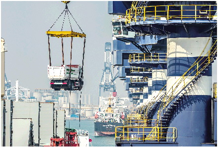 4月13日,出口科特迪瓦的车辆在山东港口烟台港装入中非班轮(无人机照片)。今年一季度,烟台港中非件杂货班轮航线发运量突破200万吨,同比增长31.9%,运输货种高度契合非洲国家基建和民生需求。