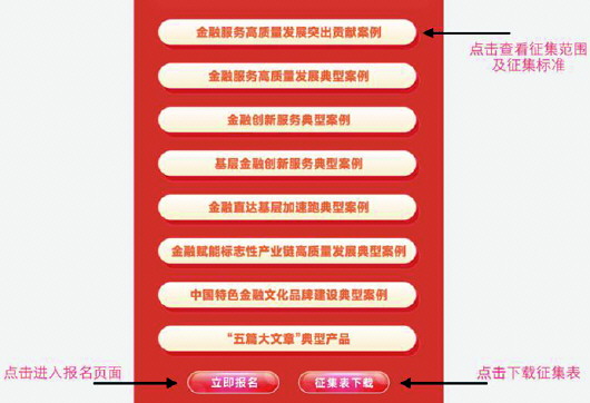 今年活动共设置八大征集领域,分别为金融服务高质量发展突出贡献案例(5个)、金融服务高质量发展典型案例(10个)、金融创新服务典型案例(10个)、基层金融创新服务典型案例(10个)、金融直达基层加速跑典型案例(10个)、金融赋能标志性产业链高质量发展典型案例(10个)、中国特色金融文化品牌建设典型案例(10个)、“五篇大文章”金融产品创新(50个)。