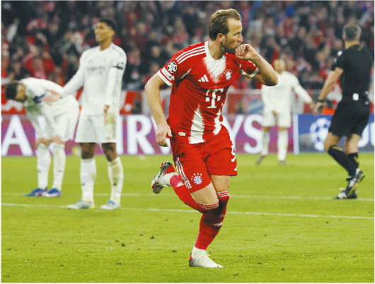 拜仁队凯恩进球后庆祝,皇马球员只能无奈地摊手。 新华社发