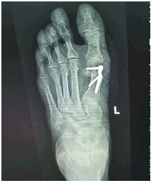 术中,于硬膜外麻醉下手术医生依托精密动力系统,分别在其左足第1跖趾关节外侧、第1跖骨远端内侧做长约0.5厘米和2.5厘米的纵行切口,沿第1跖骨颈截骨,于近端髓腔置入一枚 外翻远端板予以固定。手术过程顺利,患者术后第2天即可下地行走。