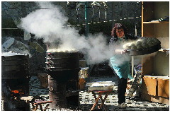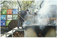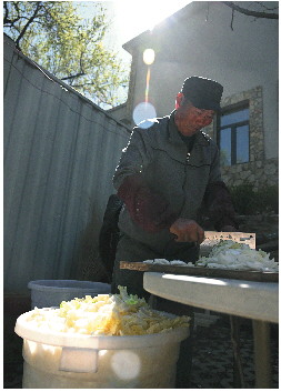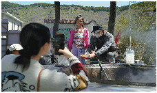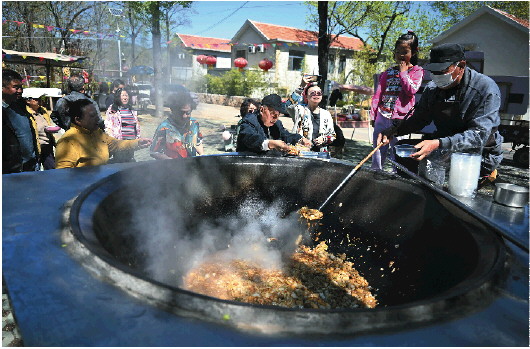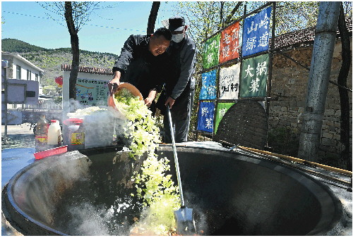为了炒好这锅大锅菜,王振特地从网上定制了一口直径两米的大铁锅,由69岁的王方桥做主厨,有经验的村民也加入进来。有的蒸馒头,有的做豆腐,有的包水饺,还有的烧烤……每逢周末,大锅菜都会如期开火。当日上午,灶台下的炉火燃烧着,烟囱里青烟袅袅。王方桥挥动着两米高的铲子不停地翻炒,香气四溢的饭菜冒着滚滚热气。不一会儿,游客们就像闻到香味儿一般,从四面八方赶来,村里路边的停靠车辆很快排起了长队。
