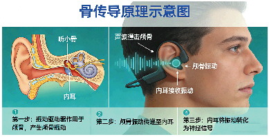 骨传导耳机没有传统耳塞式发声单元,依靠微型振动换能器,将电信号转化为颅骨振动,贴在颞骨位置,直接把声音传导至内耳。
