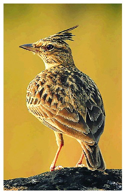 上面两种百灵,常常分不大清。在我看来,最好辨认的是“大雅兰儿”。除了体型大之外,最特别的就是它的冠羽——一大撮羽毛蓬立在头顶上,像留了一个桀骜不驯的发型。它的学名叫作凤头百灵。
