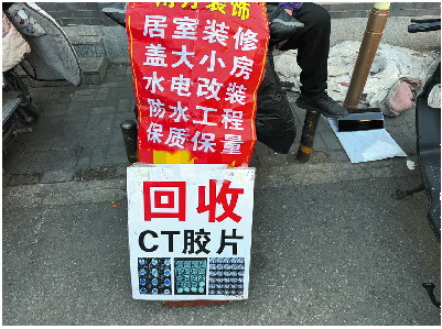 在一家超市门前,有一块写着“回收CT胶片”的牌子。摊主表示,她不回收“蓝边”的CT胶片,只要“一面黄一面蓝”的胶片。问及回收用途,对方则表示,她是代人回收,“说是二次利用,可以提炼银”。